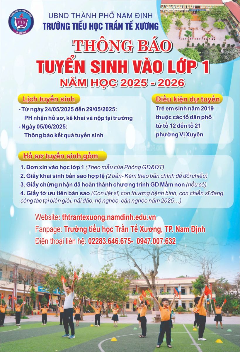 Căn cứ Quyết định 616/QĐ-UBND ngày 28/2/2025 của UBND thành phố Nam Định về việc Phê duyệt Kế hoạch tuyển sinh vào các lớp đầu cấp năm học 2025-2026; Công văn số 801/UBND-VX ngày 16/4/2025 của UBND thành phố Nam Định về việc phê duyệt điều chỉnh kế hoạch Huy động trẻ vào mầm non và lớp 1, tuyển sinh vào lớp 6 năm học 2025-2026 . Căn cứ vào tình hình thực tế, trường tiểu học Trần Tế Xương trân trọng thông báo phương án tuyển sinh lớp 1 năm học 2025- 2026