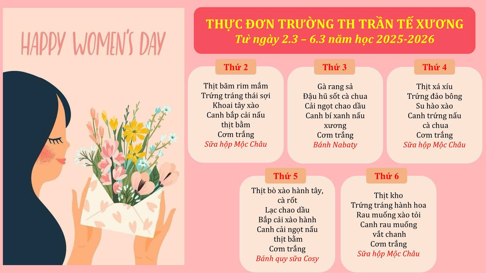 Thực đơn trường TH Trần Tế Xương từ ngày 02/03/2026-06/02/2026