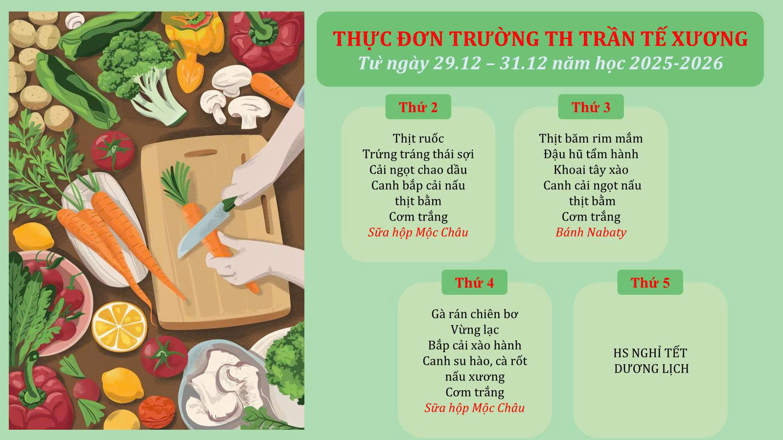 Thực đơn trường TH Trần Tế Xương từ ngày 29/12/2025-31/12/2025